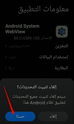 5- الان انزل الى الاسفل وانقر على "الغاء تثبيت التحديثات" ثم انقر على "حسناً"